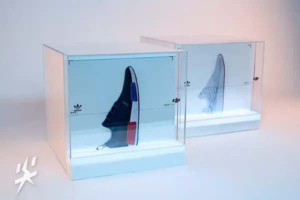 不同于平常的概念鞋盒,这次和大疆的跨界联名的鞋盒具有创造性意义的实体光条扫描,开启透明外壳的过程中,伴随具有冲击力的白色激光氛围,完成由NMD经典款OG到NMD R2的切换,将科技、未来和互动植入于城市探索的理念。