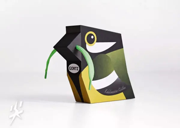 德国品牌Görtz为其童鞋产品设计了一款鞋盒包装,看着是一只可爱的卡通小鸟造型。消费者可以根据自己的喜好进行挑选不同颜色的鞋盒。小鸟的嘴巴部分是该包装的一个设计亮点,从小鸟嘴巴两侧伸出的鞋带,看上去就像这只小鸟正叼着虫子,趣味性十足。