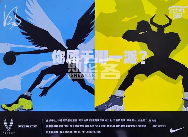 99年伊始,Nike在国内市场开启了「风雷」概念的推广。将注重速度、轻盈、灵活的Flight系列命名为「风派」,将注重力量、稳定、保护的Force系列命名为「雷派」。这一形象的本土化包装,使得Nike篮球产品线的两大分支有了更加接地气的称谓,也为日后「街舞风雷」的风靡奠定了基础。