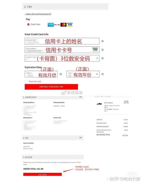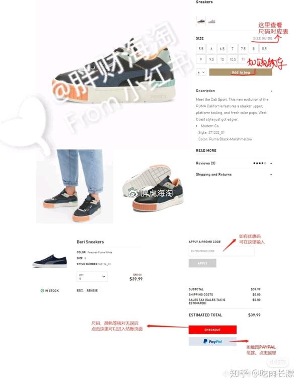 三、图4、找到商品加入购物车,还有尺码对应表的位置。加购后可以如有折扣码可以填写,没有的忽略,用PayPal付款的也标注了位置