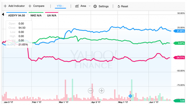 然而,这一切的一切,都被一家德国化工企业巴斯夫公司(BASF)的发明所打乱。Boost材料缓震的横空出世,不仅帮助adidas在缓震科技上有了与Nike一决雌雄的资本,更是凭借其各种运动品类都可适应的全能型(篮球,足球,跑鞋,训练鞋,休闲鞋,etc)和专利购买公司阿迪达斯的强大营销能力,成为撼动耐克运动鞋乃至运动品霸主地位的攻城锤。就拿篮球鞋品类来说,德国人旗下的中高端产品,如今已经清一色武装起了全掌Boost。对耐克更为不利的是,一家做压缩衣起身的美国公司安德玛,近年来也借着旗下头牌库里的高光表现,逐渐蚕食着自己的市场占有率。虽然在代言人和当下的市场份额上,Nike和Jordan依旧一枝独秀,但他们是时候认真面对所处的情景了。