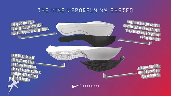 Nike在今年的破二计划中,将ZoomX中底材料用在Nike Zoom Vaporfly 4%以及Vaporfly Elite上,并加入碳板。