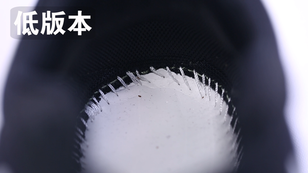 从鞋型上来看,两者的差异也不小,特别是鞋领的地方,差异也挺明显。低版本的鞋领就像是被一双大脚撑开一样,松松垮垮,毫无包裹性可言,相较之下,高版本的鞋领好上不少,整体的形状还算不错。然后是后跟,低版本的后跟简直惨不忍睹,就一个字---假。