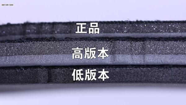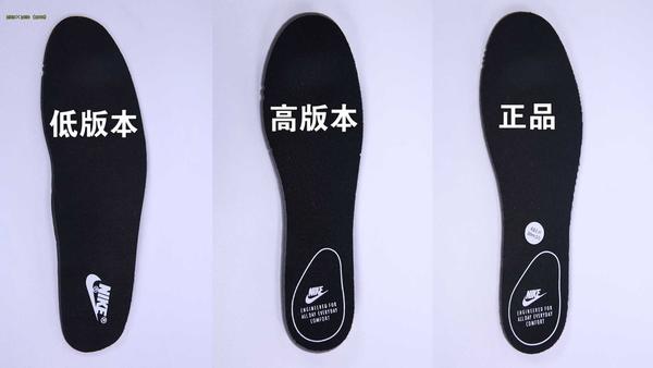 我们再来看看鞋垫,它们分别是低版本,高版本跟正品,低版本的我就不多吐槽了,我们主要还是来关注高版本跟正品之间的对比,因为鞋型的原因,鞋垫的形状还是略有差异,鞋垫后跟处的LOGO图案相同,但是精品鞋的印刷质量较差,图案不是很清晰,鞋垫背后同样拥有胶水粘连,但是精品鞋稍微偷工减料,只张贴了一半,而正品则为四分之三。再来看看鞋垫的侧面,让我意外的是精品鞋的鞋垫竟然比正品还厚,但是这也不能说明什么问题就是了,只能说商家还是有点良心的。