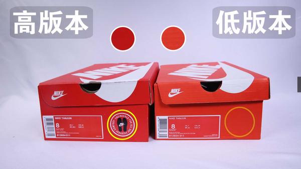 本次评测对比的鞋子分别是低版本、高版本跟正品,首先是鞋盒,左边的是高版本,跟正品是一样的,而右边的则是低版本;高版本会比低版本的鞋盒略大一些,质量也会更好一些;而且两者的颜色也不一样,高版本的是红色,低版本则是橘色,最主要的是高版本的鞋盒侧面还有一个nike的球鞋标志,而低版本则没有。