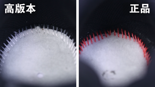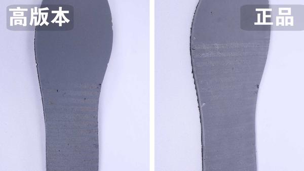 紧接着我们来看看关键的中底对比,低版本的精品鞋还是一如既往的简陋,除了材质不同外,走线也相当不走心,反观高版本中底,跟正品对比起来毫不逊色,除了材质相同外,走线也十分牢固稳健。