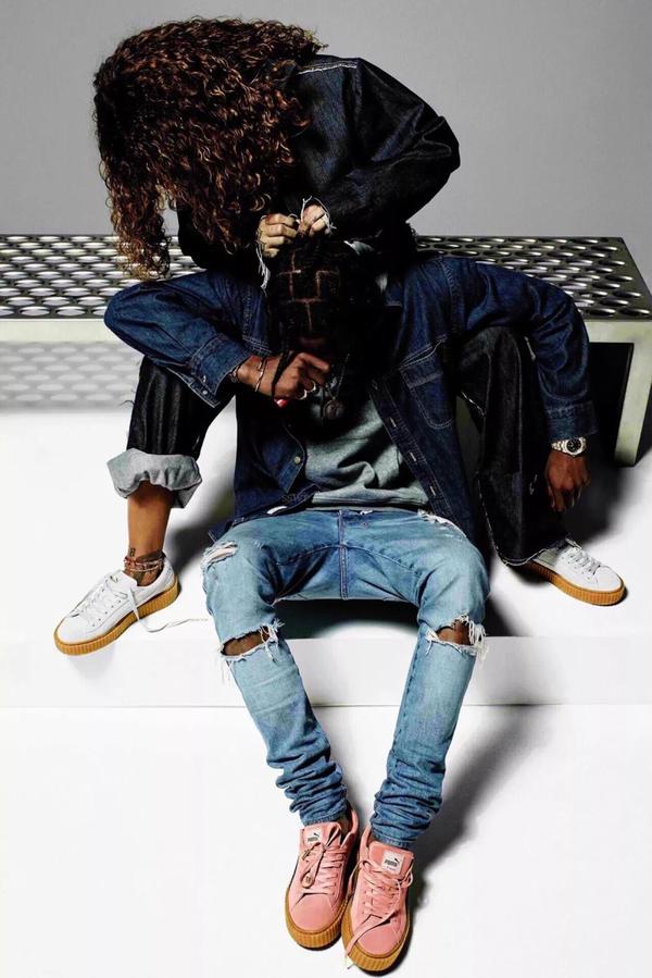 • > 而她和PUMA神话的开始便是从一双鞋开始——Rihanna x PUMA Suede Creeper。2015年9月,这双松糕底在面试后迎来了市场强烈的反响,厚底的设计加之质感十足的麂皮单元,都让女生们为之倾倒,也着实让男生们羡慕不已。我们看当年的这张海报,邀请Travis Scott一同拍摄的Lookbook,如果放在今天又会获得怎样的市场反响,想必也无需我多言。而PUMA Suede Creeper在出现伊始,所针对的也正是女性市场,可见其在市场中所起到的作用。