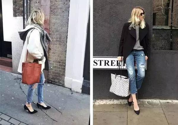 正式感的黑色高跟鞋搭配破裤别有韵味。↓↓↓