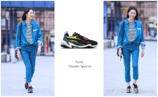 都知道刘雯热衷于旅游,于是在其游客照中看到这双Puma Thunder Spectra运动鞋也就见怪不怪了~身穿长款衬衫下搭牛仔裤的刘雯,以一身浅蓝色的着装脚下搭配白色“老爹鞋”,给人感觉十分清爽和养眼!