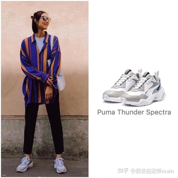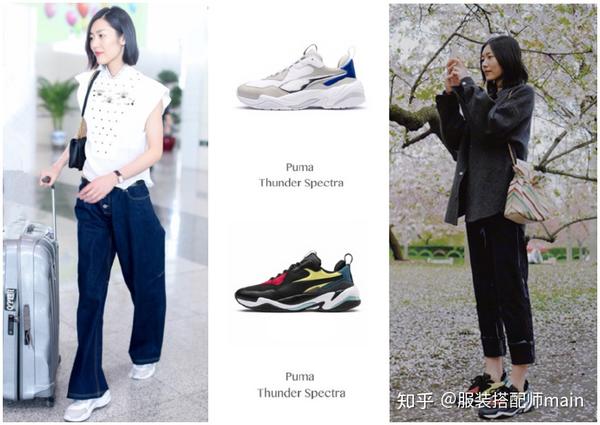 前面这些造型都是刘雯以浅色系穿扮来搭配白色“老爹鞋”,既时髦又潮范儿!然而你也别忘了白色具有百搭效果,事实上,用白色“老爹鞋”配搭深色系穿扮也一样很完美!只见刘雯身穿一件拼色衬衫下搭黑色长裤,脚上依旧是Puma Thunder Spectra白色运动鞋,深色着装+浅色鞋的组合更显潇洒和利落。