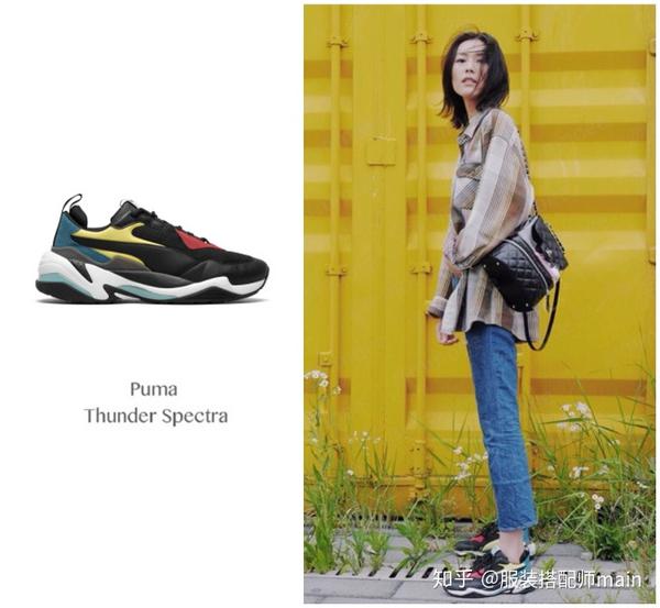 除了上面的白色款Puma Thunder Spectra“老爹鞋”外,另外这款黑色的Puma Thunder Spectra运动鞋在刘雯的街拍造型当中出镜率也很高!且不同于白色款的百搭,当刘雯穿起黑色款之后,反而更加凸显出超模的时髦气质~