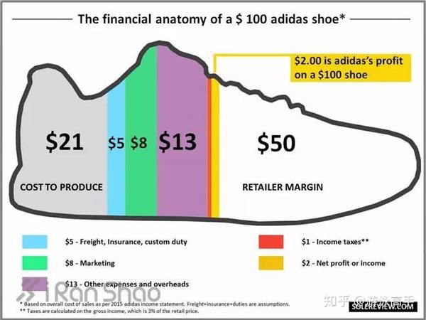 一双100美元的鞋,阿迪达斯只能赚到2美元。耐克的进展要好得多,每双100美元的鞋能赚到5美元。
