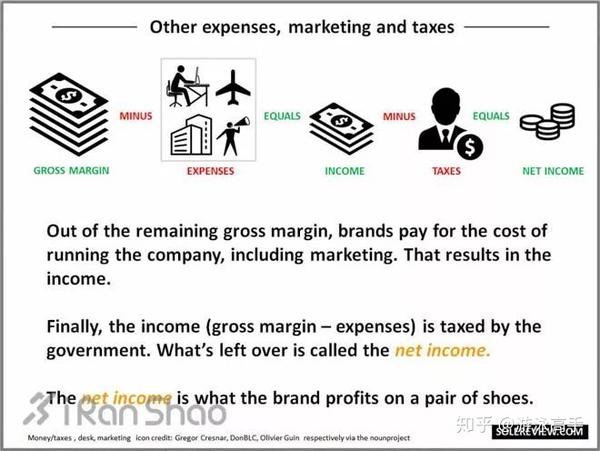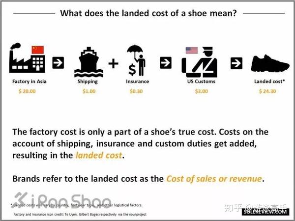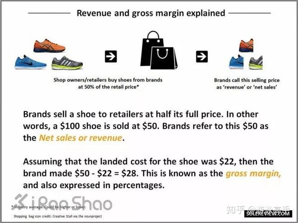 就像上图中的,100美元的鞋子最后的到岸成本是22美元,品牌商卖给第三方零售商的价格是50美元。所以,对于品牌上来说,毛利率为50美元-22美元=28美元。