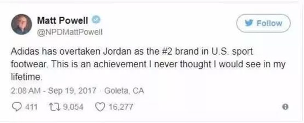 苦心经营,市场份额超越 Jordan Brand 。这可能是最让 adidas 高层们舒心的一个收获了——根据美国市场研究机构 NPD Group 发布的2017年8月份数据显示,德国运动用品巨头 adidas 凭借着 13% 的市场份额,已经超越 Nike 旗下品牌 Jordan Brand 成为美国第二大运动鞋销售商。 Nike 以 37% 的份额继续稳坐头把交椅, Jordan 为 9.5% 。 NDP 的资深分析师 Matt Powell 在其个人 Twitter 上更新了这一消息,还附言“以为这辈子都无法见证这一刻”。