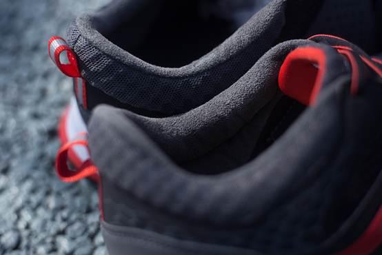 鞋身的整体包裹性也不错。当然,这也首先得益于它本身比较窄的鞋楦设计,其次才应该要鞋身两侧的增强包裹设计。系紧鞋带后,包裹感确实很强,甚至有点过分了!这种包裹感比较生硬,跟现在流行的那种柔软鞋面的包裹感完全不可同日而语。