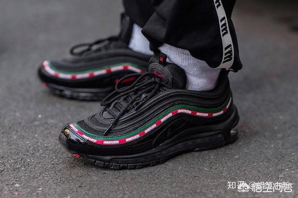 这双是Undefeated × Nike Air Max97联名款,黑白两色都加入了漆皮材质,都带有 UNDEFEATED 字样的Gucci配色“波浪纹”环绕于鞋面之上,黑中带点醒目的颜色更能惹人注目。
