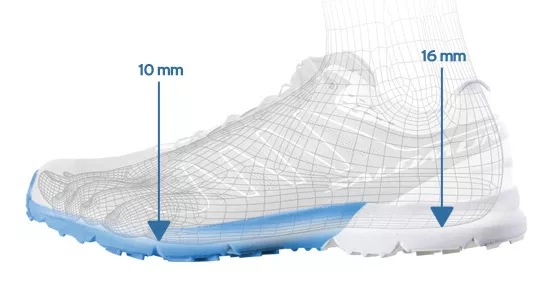高度落差是大多数人会忽略的问题,当然也包括我。高度落差是指一双越野跑鞋的前掌高度和后跟高度之差值。一般来讲,前后高差和缓震材料的厚度关系比较密切。通常情况下,一双越野跑鞋的高度落差会在10-12毫米的范围之内。按照高度落差可以分成三类。第一种是零落差,即强调前后足高度一致,具有代表性的是五指鞋和ALTRA品牌,这一理念强调了人类最原始的奔跑方式。其次是低落差,低落差大概指前后足高度在0-4mm的跑鞋,大多数极简跑鞋属于此范畴之中。此外,前后落差大于4mm的都可以划入高落差的范畴,这个范围通常比较广。