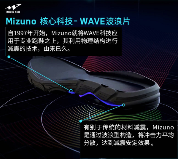 美津浓的跑鞋技术很多,而Wave是其跑鞋拥有二十年积累的看家技术,这是一种机械减震技术,美津浓有各种Wave,几乎每一双美津浓专业跑鞋都有Wave,防止摇晃,抵抗偏移,在缓震性和稳定性上有很好的结合。