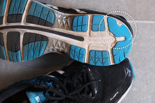 如果鞋底其余部位磨损尚可,但一侧出现严重磨损(即可能跑者的落地方式存在问题,导致一侧最早/最长时间与地面磨擦),这也意味着你需要换鞋了。