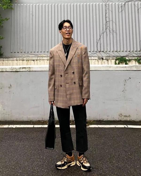就像宽松的格纹西装搭配老爹鞋就是很潮流的风格,受到一大批年轻时尚icon的热衷,造型具有复古的风调。正是这一波潮流的大热,使休闲西装更受欢迎,加上一双复古潮流的运动鞋造型就显得很吸晴。