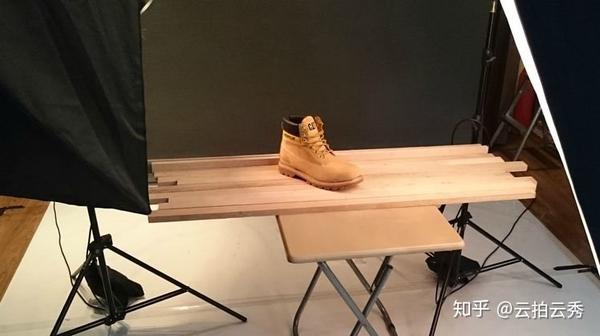 背景方面在背景架上挂上一张黑色背景纸,目的是减少不必要的反光,然后在桌上拍摄。因为找不到木板,所以用很多木条拼在一起,模拟地板的地景。