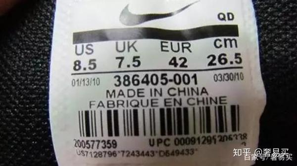 耐克的生产地国家英文倒数的第三个字母,要与正下方的字母在同一条直线上,也就是,生产地国家的英文CHINA中,倒数第三个字母I和正下的字母C必须要在同一直线上。