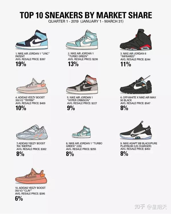 欧洲潮流媒体Highsnobiety携手StockX球鞋交易平台发布的2019年第一季度球鞋转卖报告中:Jordan Brand凭借近来主推的Air Jordan 1鞋款占据了榜单最多的席位、adidas也凭借三双Yeezy家族鞋款有所斩获、科技鞋款Nike Adapt BB也颇受大家的青睐。