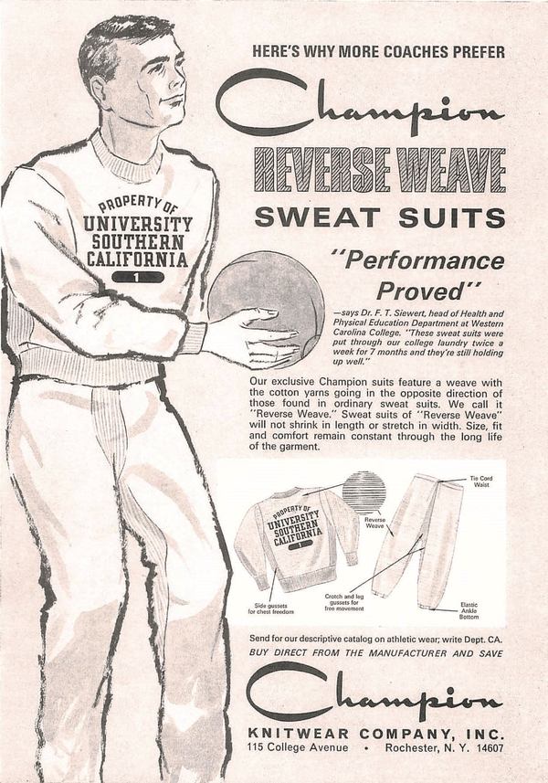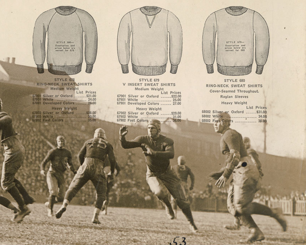 于是 Ben Russell 在这样的需求下开始了面料的选择和研发,最终推出的,便是我们今天看到的 Sweatshirt 的雏形。由于这种运动服能够很有效的改善运动员的穿着体验,因此很快便在球队甚至是整个运动圈里得到认可。