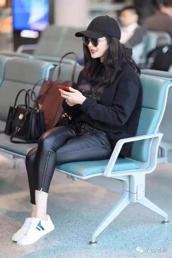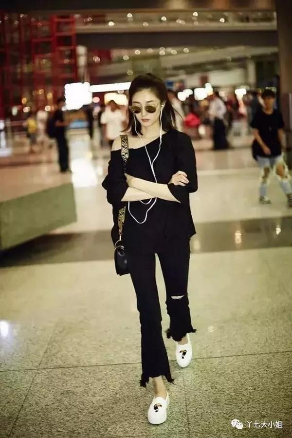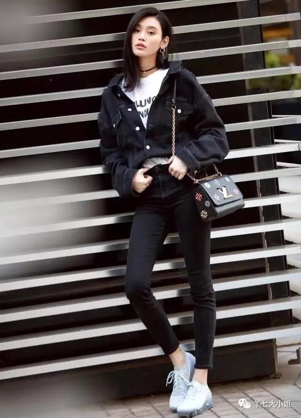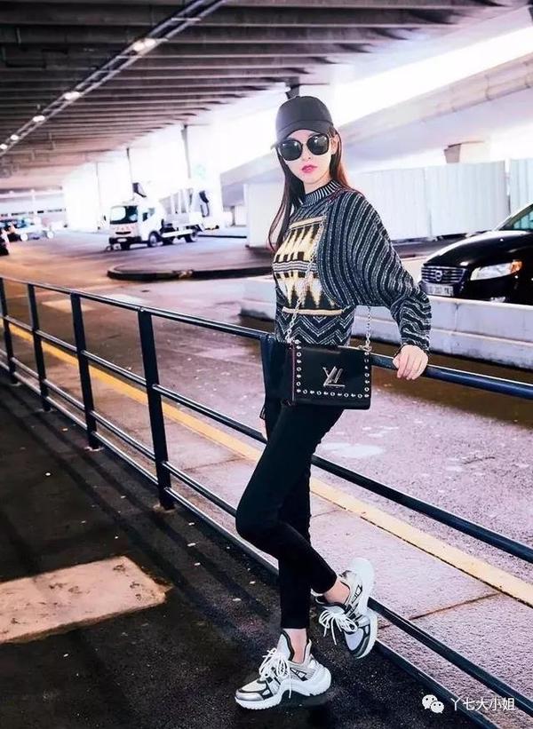 黑色小脚裤,搭配今年火爆的老爹运动鞋,明星们都在抢着穿,赶潮流的小仙女可以学习唐嫣这样穿搭。不过如此厚重的鞋子,真的不太适合小矮个哦~,没有一个修长的身材真是hold不住。▼