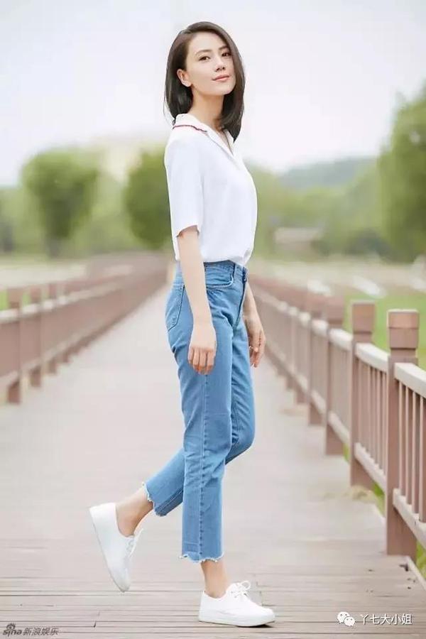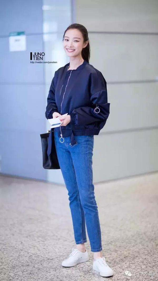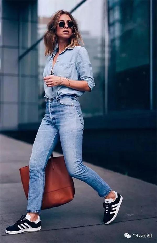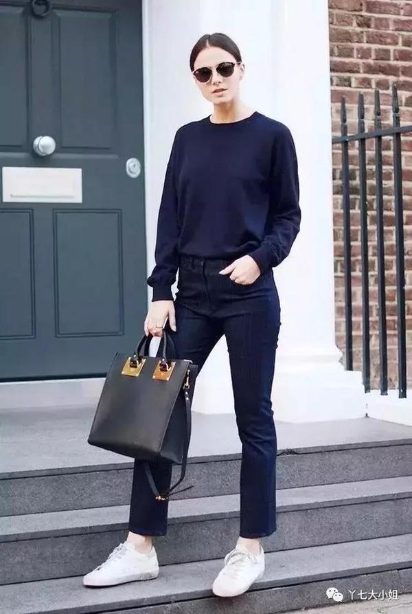 蓝色牛仔小脚裤,比起黑色裤子,更多了一分青春感,搭配一双运动鞋,满满的校园风,舒适又有活力。▼