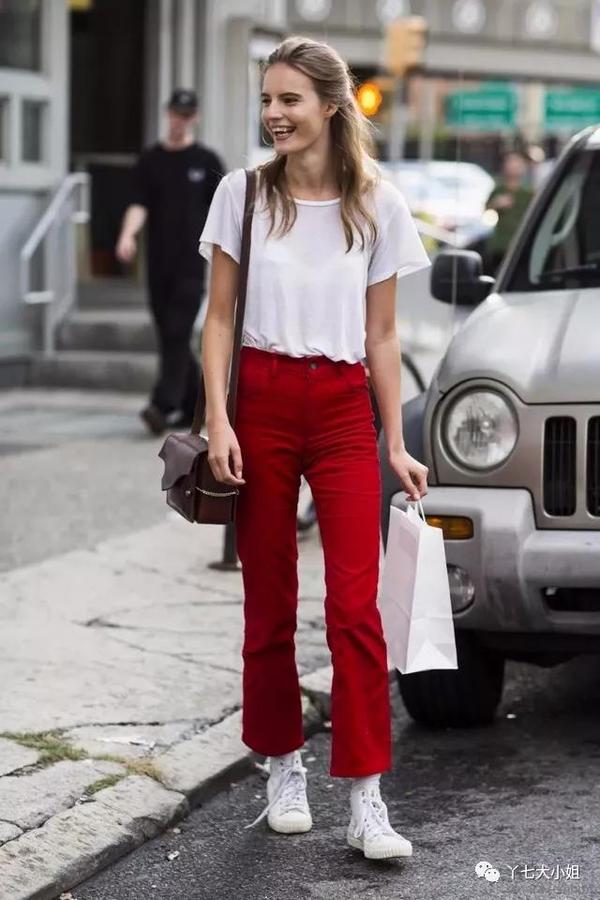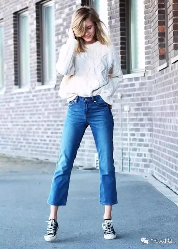 九分喇叭裤+运动鞋