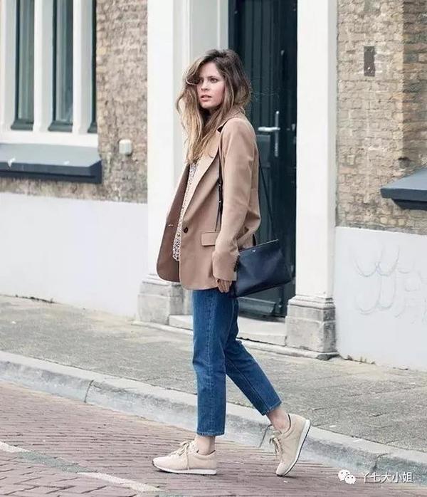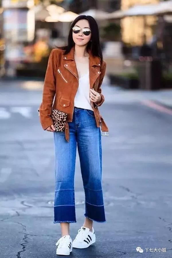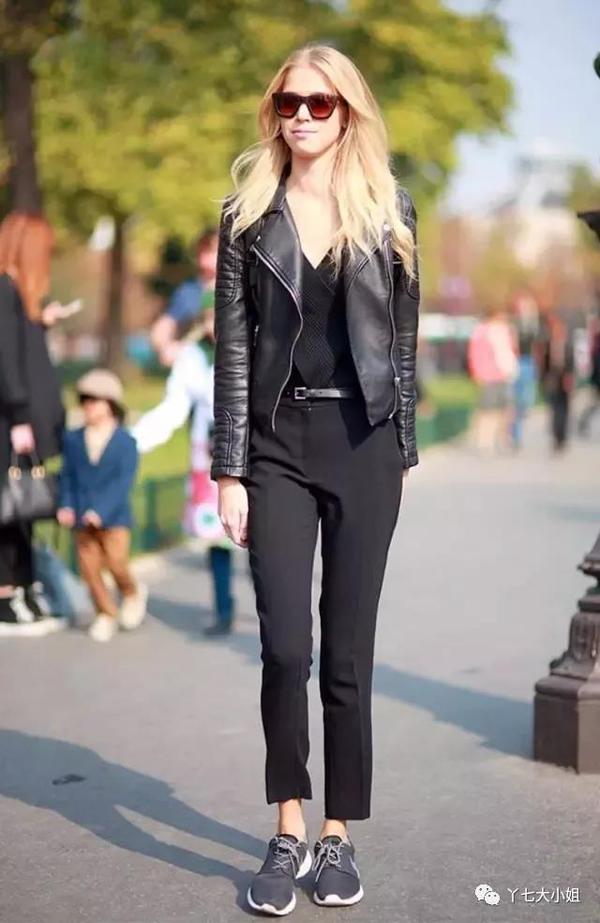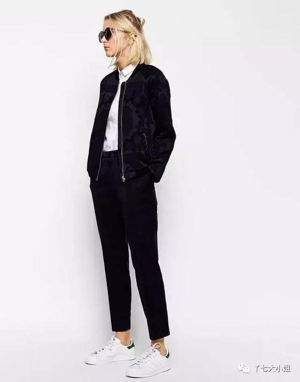 九分烟管裤+运动鞋,上衣也可以搭配皮夹克、飞行员夹克等各种上装。▼