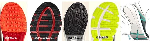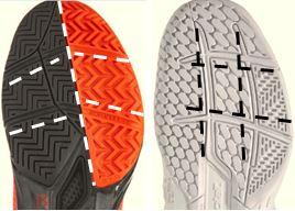 而像跑步、健步走之类的单方向移动的sports, 纹路多为 横向沟槽,保证前后移动时产生纵向的摩擦力 及 flexibility :