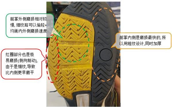 因为前掌内侧是网球运动时主要受力部位(人体重心前压), 加宽的底纹能保证最合理的触地面积。