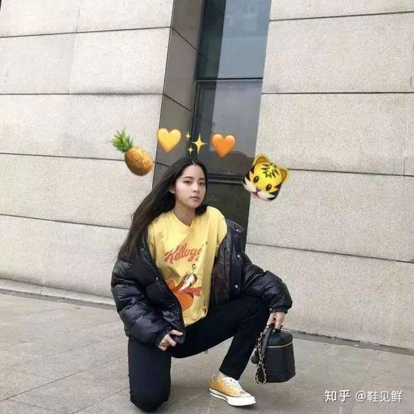 亮色比较适合搭配暗色,藏蓝色毛衣和军绿色工装裤都是属于比较暗的颜色,配上一双黄色匡威1970s,很显个性,不落俗套。