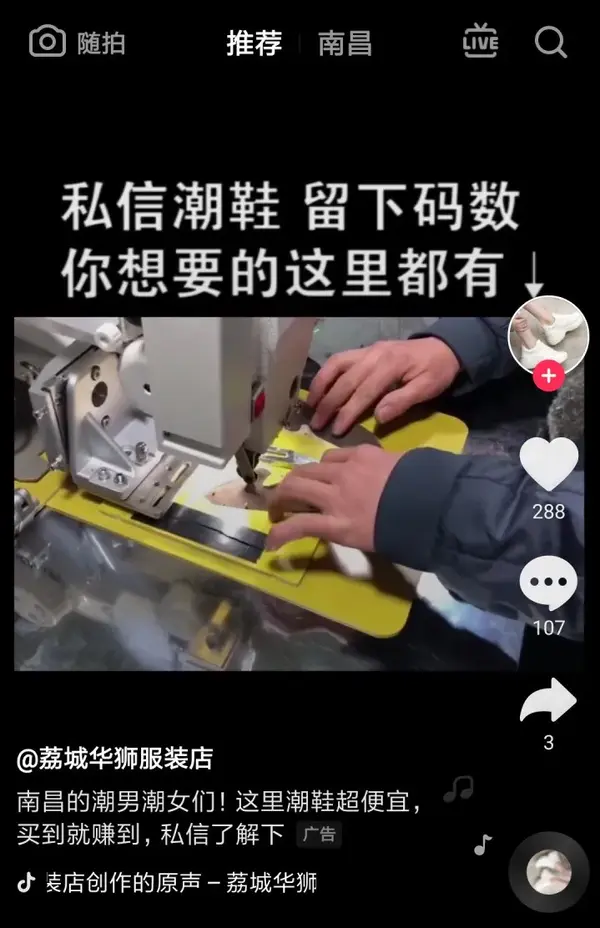 最近,她多次在抖音上刷到潮鞋广告,点进页面发现,鞋子来自福建莆田。