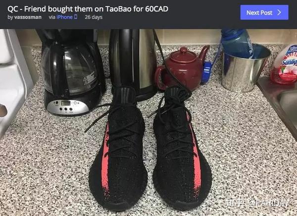 把朋友花了 60 加币( 约 300 多人民币),在淘宝买的一双 Yeezy 350 V2 黑红晒出来,会收获各种“ nice,nice,酷,酷,lit,lit ”的评论。
