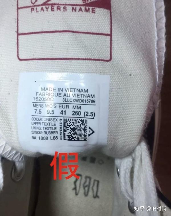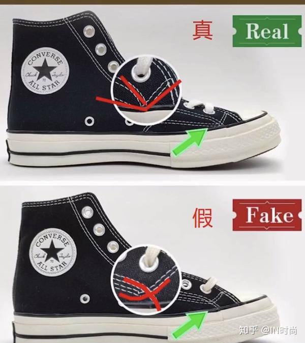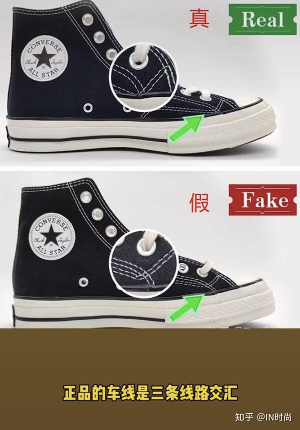 以上鉴别方法适用于市面上大部分的精品品,但有些莆田的版本对比下来会发现细节做的很到位,鞋标字体粗糙、印刷歪斜不贴合、走线不齐、鞋头偏大、鞋底胶质等等精品品特质在一些莆田鞋上是找不到的。对一些高质的莆田鞋,不能做工细节去对比,只能是从上脚感觉来辨别,对比正品,莆田高质的Converse帆布别踩实感更强,而正品的踩实感会稍软,站久了正品的疲累感会低于莆田的精品品。
