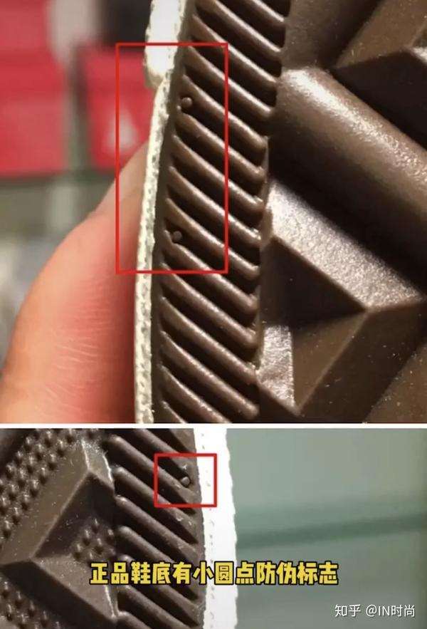 9、 看鞋底防伪标志:一般正品的鞋底边边都会有小圆点的防伪标识,而且小圆点处理表面比较光滑,精品品的鞋底要么是没有小圆点的,要么就是小圆点表面处理不光滑直接是横切出来的。