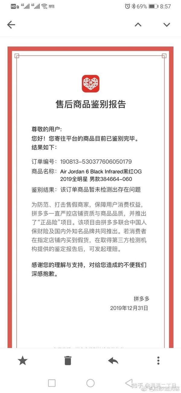 3、说一个大胆的预测,因为鉴定的依据是在不断更新的,这就是鉴定师学习的过程,所以不管是什么平台,但凡是高危鞋款的购买都是要倍加小心的,所以早些时间如果有买AJ6的朋友,我建议大家可以再次去鉴定一下,以免安心。不过也可能鉴定完了堵心。。。。
