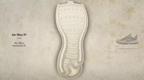1997年Air Max 97问世,标志着真正意义全掌可见式气垫的诞生。Nike研发出先进的制模技术,使得前后掌气垫的连接变为现实。加上夸张的大开窗,让气垫控们大饱眼福,也为Air Max吸粉无数。