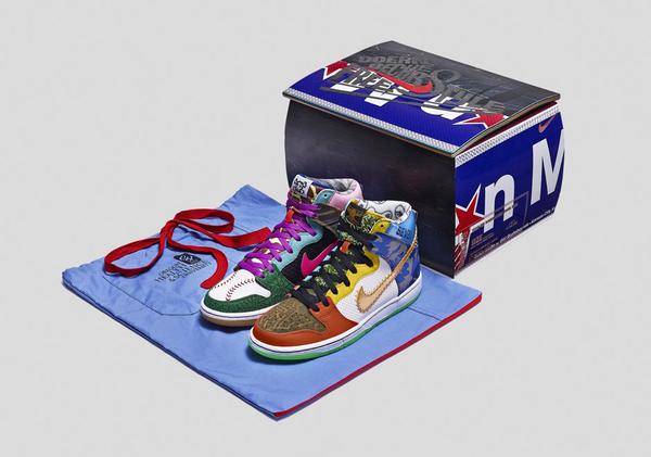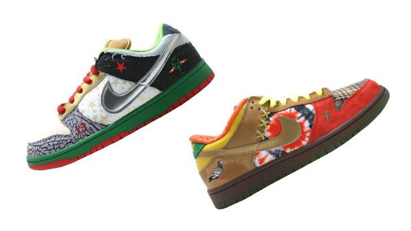 想象一下,把以上的那么多鞋子,全部元素配搭在一起,是怎样的?很难想象吧。What The Dunk这对鞋,就这样被设计出来了。左边和右边,是不一样的。以下这对限量版,是2007年的滑板纪录电影《Nothing but the Truth》上映,为了帮电影造势,推出了300双Nike Dunk SB “What The Dunk”,现在市场价,我就不清楚了。