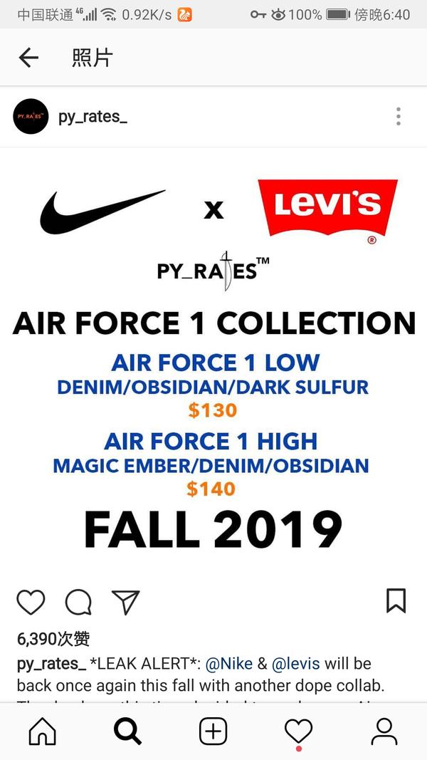 时间来到了2019年的4月27日,我无意间在Instagram的py_rates上刷到Levi's 将与Nike进行合作的消息,选用的还是我最爱的Air Force 1鞋型。