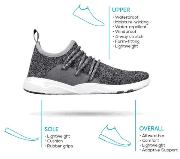 鞋面采用了Flash Knit新型防水技术,进行了3层设计。最外层是弹力编织层,中间是纳米过滤层,里面是透气内层。