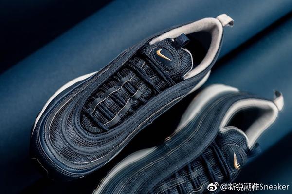 这款Nike Air Max 97整体是以午夜海军蓝为主色,大底采用的是金光泽的金色和白色搭配。鞋面原则上是用海军蓝材质网眼和皮革构成,水波纹的地方采用3M反光材质附加在条纹上,在晚上的时候格外抢眼。鞋子侧边干跟鞋舌部分的迷你的Nike Swoosh都是采用金线刺绣。鞋底气垫内部是360°全部包裹金属图层,中间使用白色色中底隔开