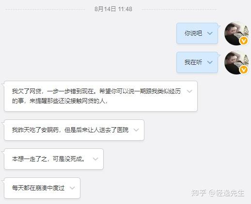 “我欠了网贷,一步一步错到现在。希望你可以说一期跟我类似经历的事,来提醒那些还没接触网贷的人,我昨天吃了安眠药,但是后来让人送去了医院,本想一走了之,可是没死成,每天都在崩溃中度过。”