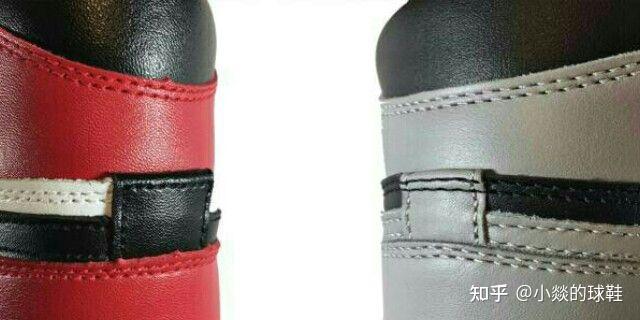 Aj的鞋跟处有一处缝合的小皮革,正品灰色的小皮革有两条缝线,精品品红色的小皮革只有一条缝线。正品不会使用和此处皮革颜色相同的缝合线,用黑色的线缝在灰色的皮革上,颜色对比十分鲜明。精品品不是,用黑色的线缝合在黑色的皮革上,完全看不出来。