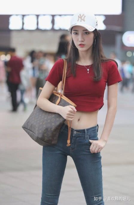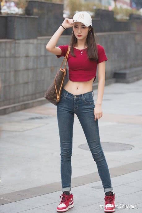 这个小姐姐就是穿着一条九分的牛仔裤来搭配血液AJ的,还卷起了一圈裤脚,可以看到鞋子的全部。像在天气没有那么冷的时候,有很多人都开始穿短袖,短袖和牛仔裤也是蛮搭配的,而且小姐姐的短袖还是很紧身的款式,搭配起来好显身材。