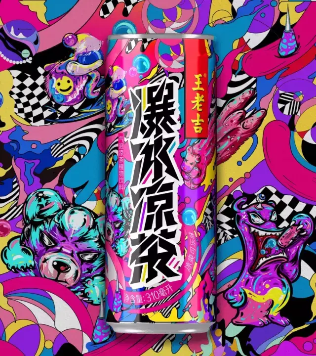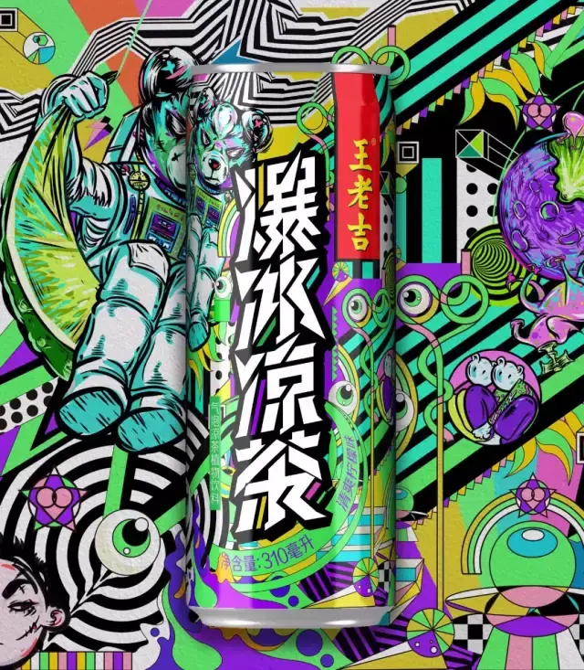 王老吉推出了一个新品--爆冰凉茶,有清爽柠檬和冰爽可乐两个口味,画风奇幻耀眼。