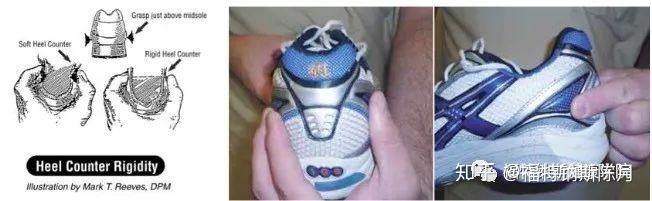一定的脚跟稳定刚度可以在步行和跑步的过程中帮助支撑后脚。跑鞋的后跟处拥有一定的硬度不但能给脚跟处提供支撑,并且能在一定程度上防止脚内翻。测试脚跟稳定刚度的步骤如下,将鞋子放在一只手的手掌中,并用另一只手的拇指和手指挤压鞋子的后跟处来评估鞋后跟处的硬度。
